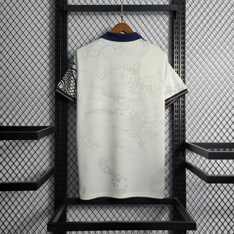 A Camisa Real Madrid Dragão Branco 2022 Torcedor é uma edição especial que celebra a rica história e tradição do clube. Com um design arrojado, apresenta um dragão estilizado em destaque, simbolizando força e poder.