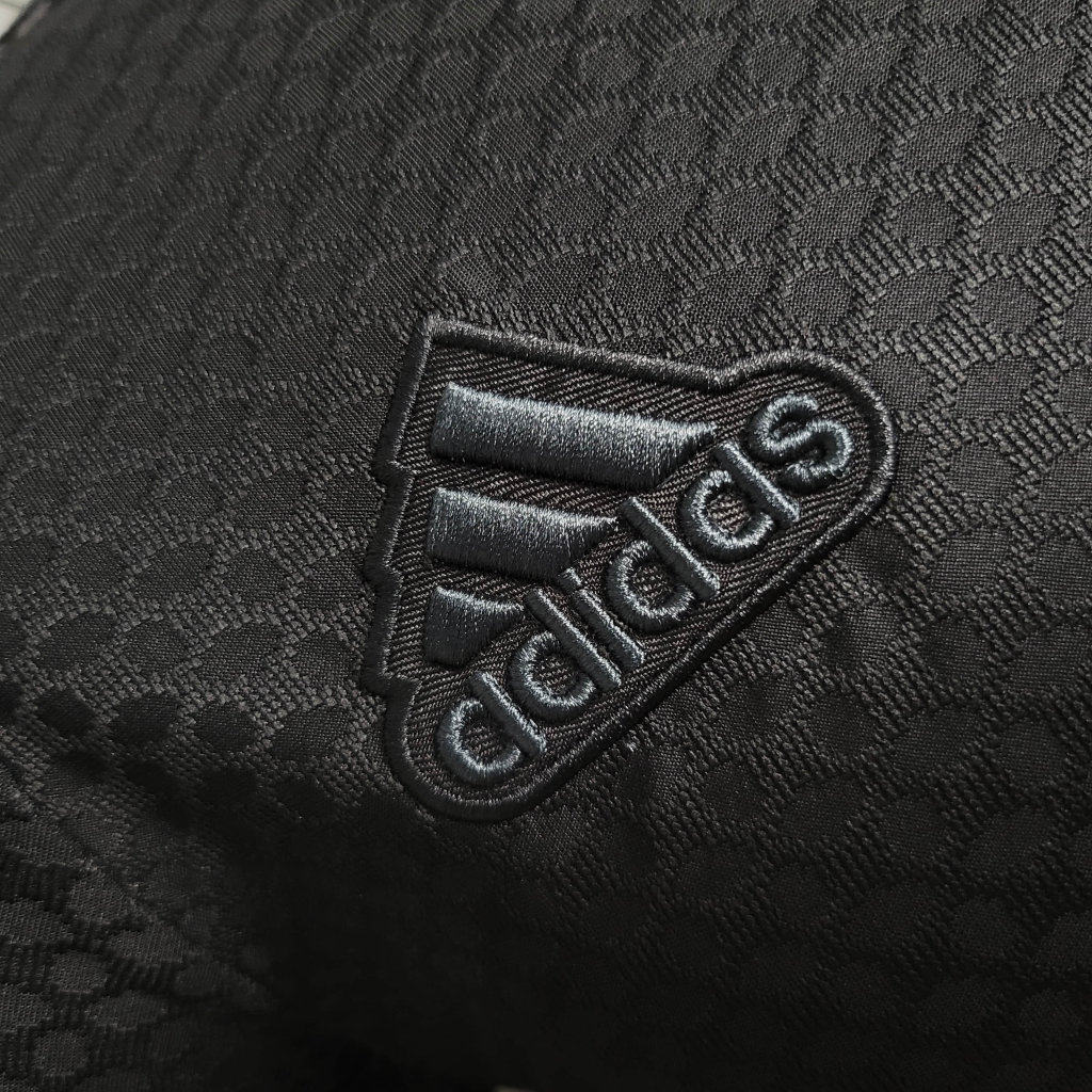 A Camisa Lifestyler do Real Madrid para a temporada 2023/24 apresenta um design moderno e elegante, destacando-se pelo seu tom preto com detalhes em amarelo. O escudo do clube e o logotipo da Adidas são aplicados em amarelo vibrante, proporcionando um contraste marcante. A inscrição "RMCF" está presente na parte interna da gola, adicionando um toque personalizado ao uniforme.