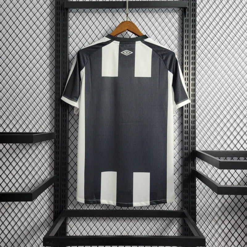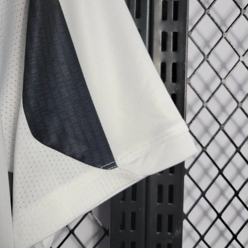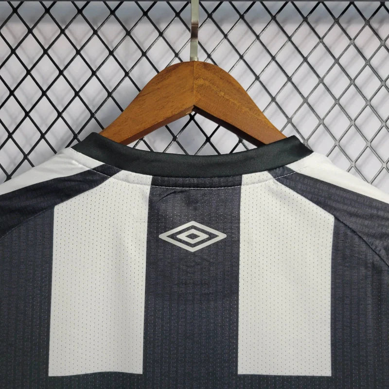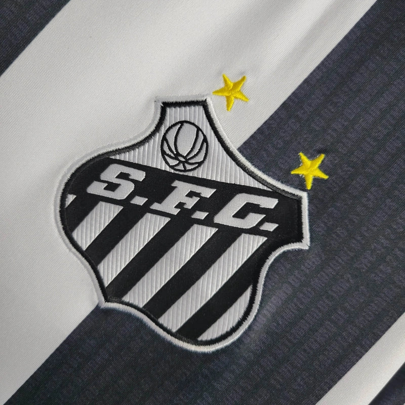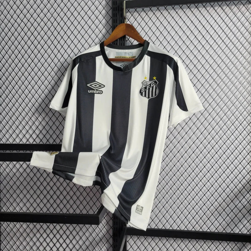A Camisa II do Santos para a temporada 2022/23, produzida pela Umbro, celebra os 60 anos do primeiro título mundial do clube, conquistado em 1962. O design clássico apresenta listras verticais em preto e branco, com detalhes especiais nas listras pretas que incluem a inscrição da data, local e placar das partidas finais contra o Benfica.