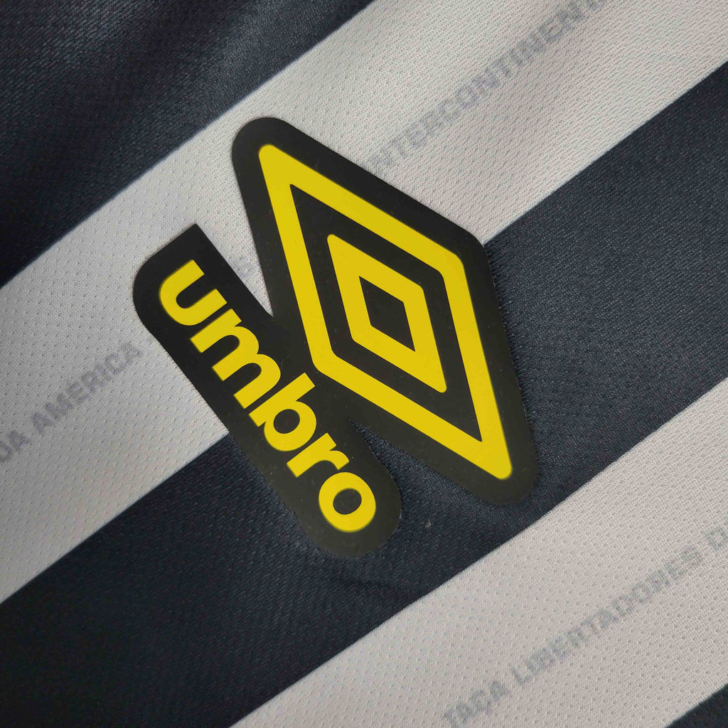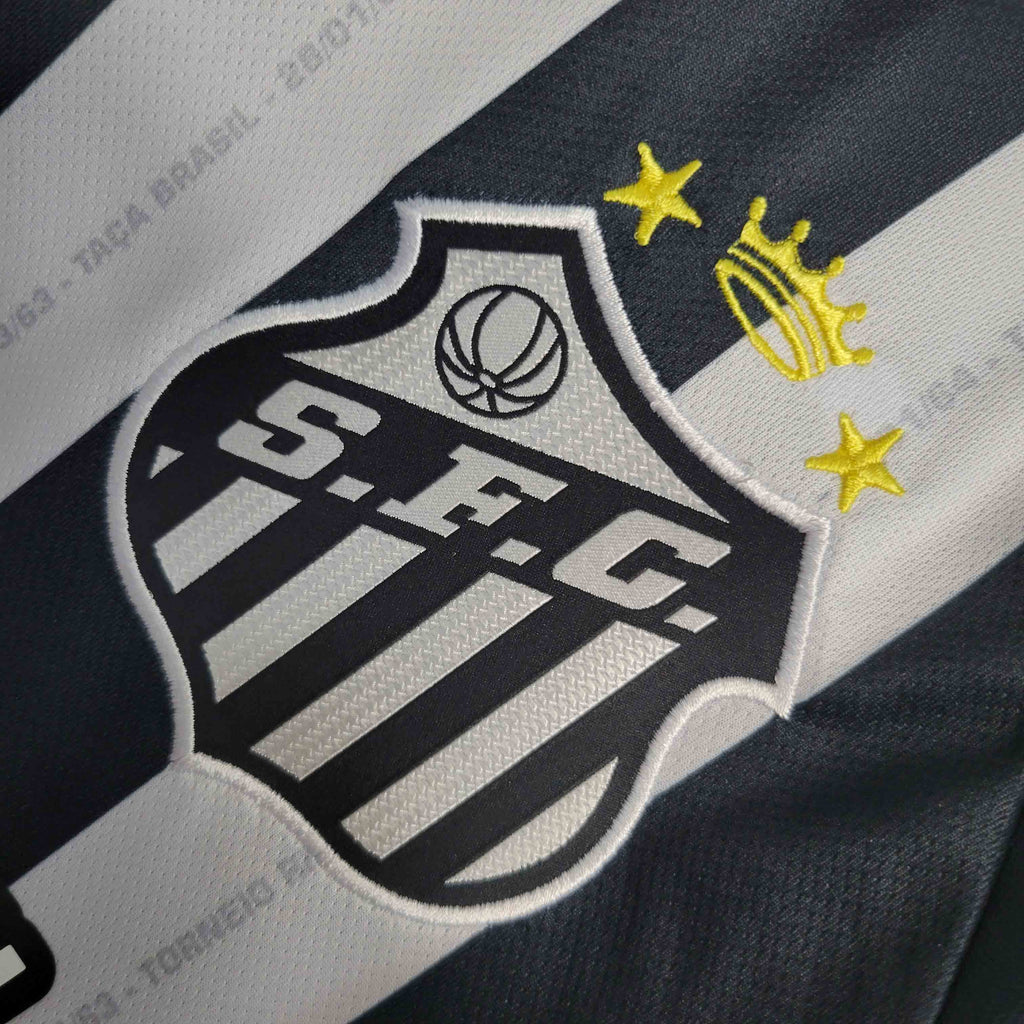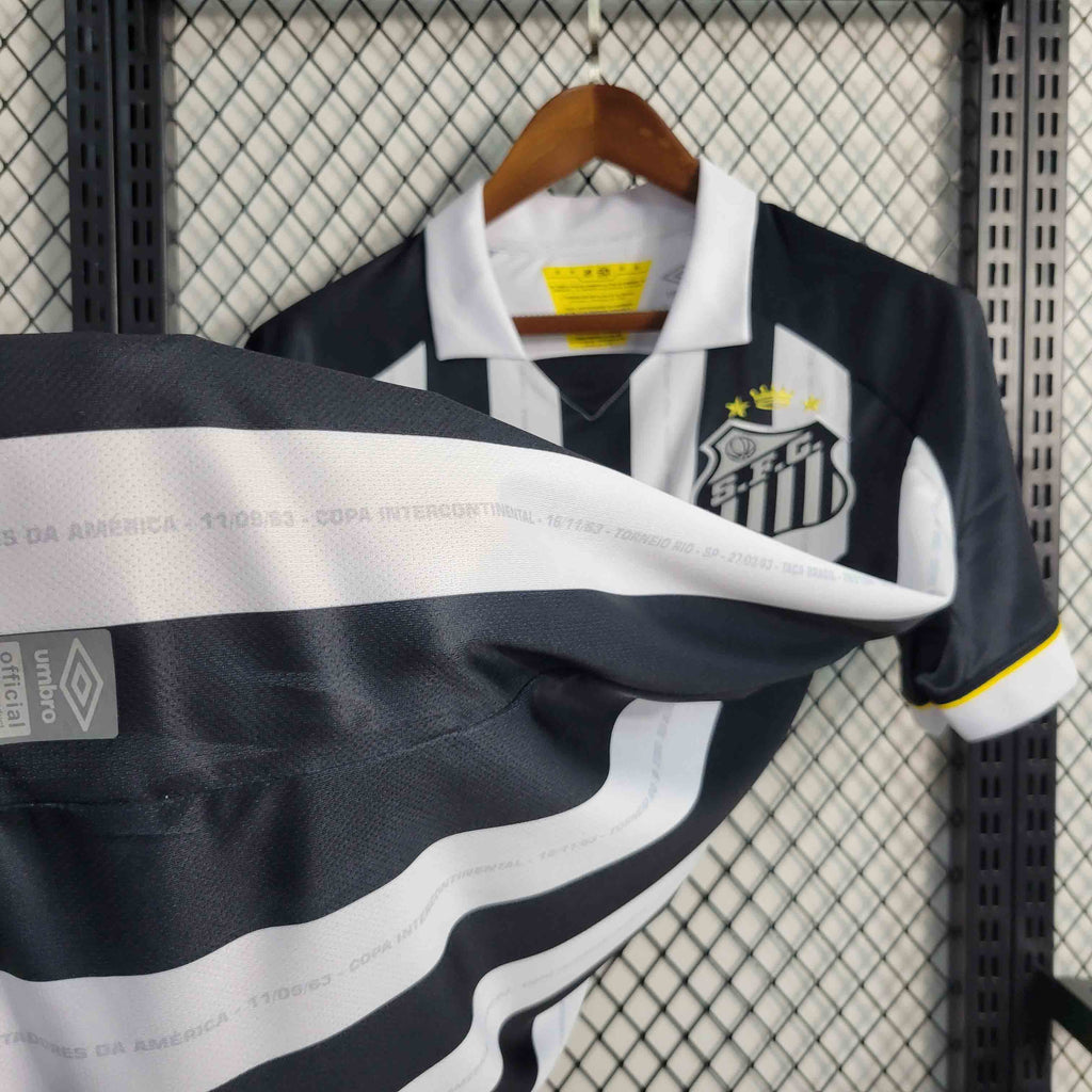 A Camisa 2 do Santos para a temporada 2023/24, produzida pela Umbro, celebra os 60 anos das conquistas históricas de 1963, quando o clube venceu o Torneio Rio-São Paulo, a Taça Libertadores, a Copa Intercontinental e a Taça Brasil. O design apresenta as tradicionais listras verticais em preto e branco, com detalhes em dourado na gola e elementos gráficos que homenageiam o estádio Vila Belmiro.