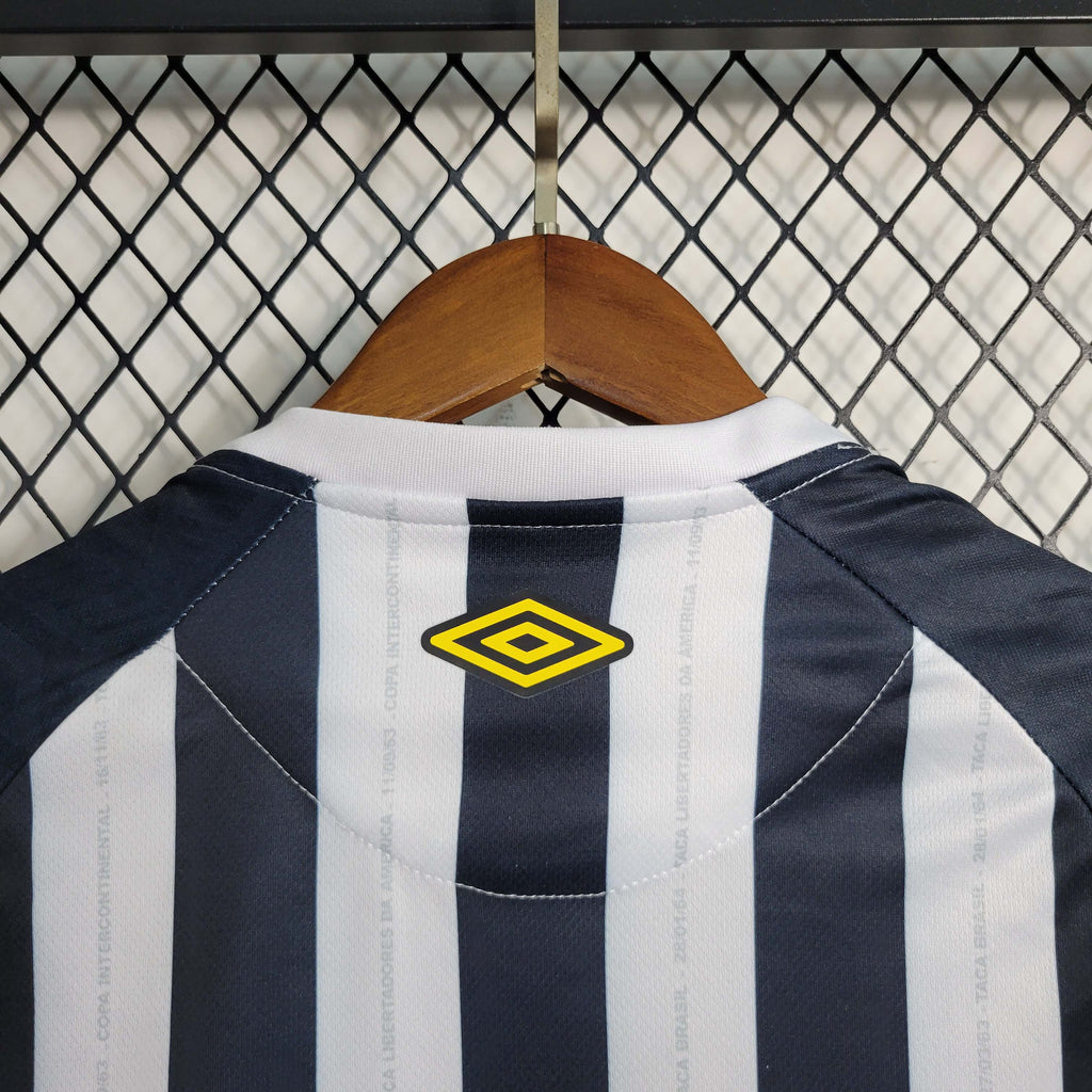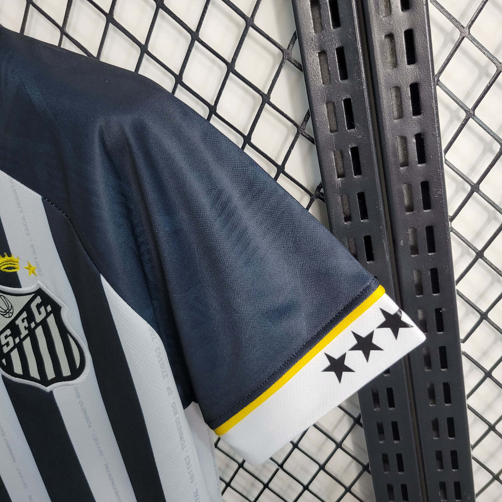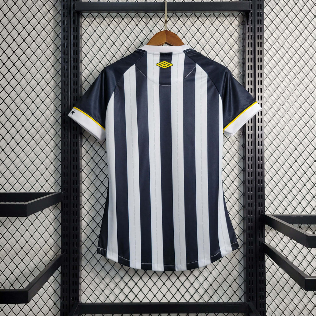 A Camisa 2 do Santos para a temporada 2023/24, modelo feminino, apresenta as tradicionais listras verticais em preto e branco, com detalhes em dourado na gola e elementos gráficos que homenageiam a Vila Belmiro. Confeccionada em poliéster e elastano, oferece conforto e estilo para as torcedoras.