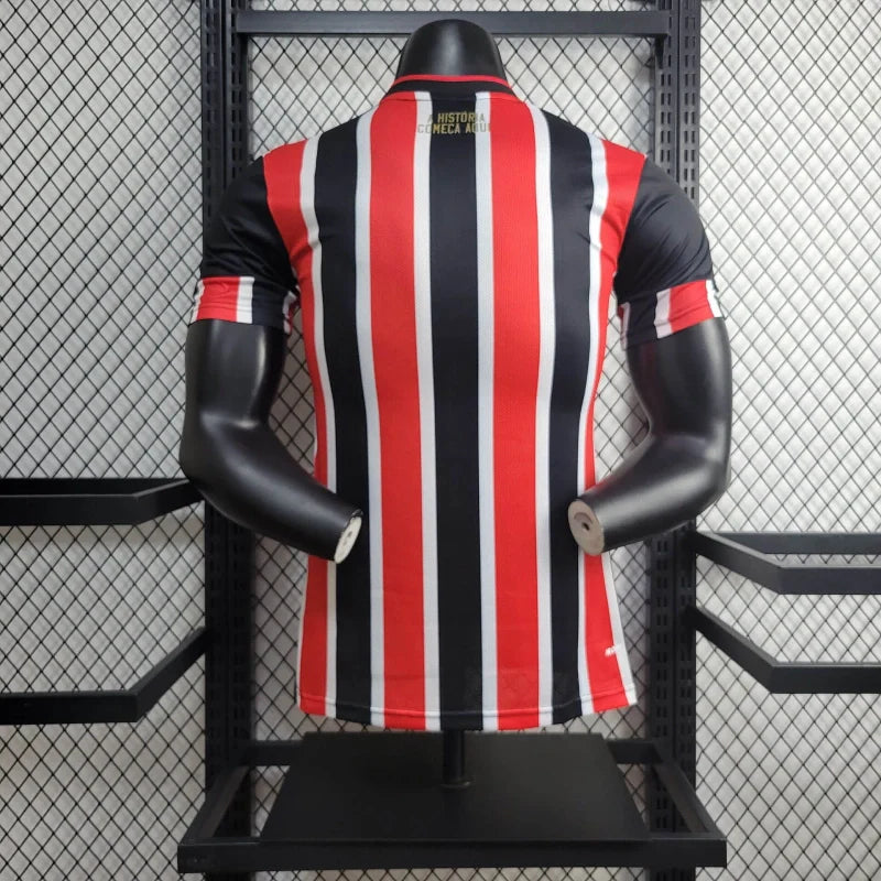 A Camisa II do São Paulo FC para a temporada 2024/2025, versão Jogador, destaca-se por seu design clássico e elementos que celebram a rica história do clube. O manto apresenta as tradicionais listras verticais em vermelho, preto e branco, simbolizando a identidade tricolor. A gola em formato V e as mangas listradas complementam o visual elegante da peça. Na parte traseira, a inscrição "A História Começa Aqui" reforça o compromisso com as futuras conquistas. Internamente, atrás do escudo bordado, encontra-se a frase "Sentimento que jamais acabará", enfatizando a paixão eterna pelo clube. Além disso, a camisa possui um selo na barra com a frase "Made in Cotia: atletas e cidadãos", homenageando os talentos formados nas categorias de base do São Paulo FC. Confeccionada em poliéster de alta qualidade, a peça oferece conforto e desempenho ideais para os atletas em campo.