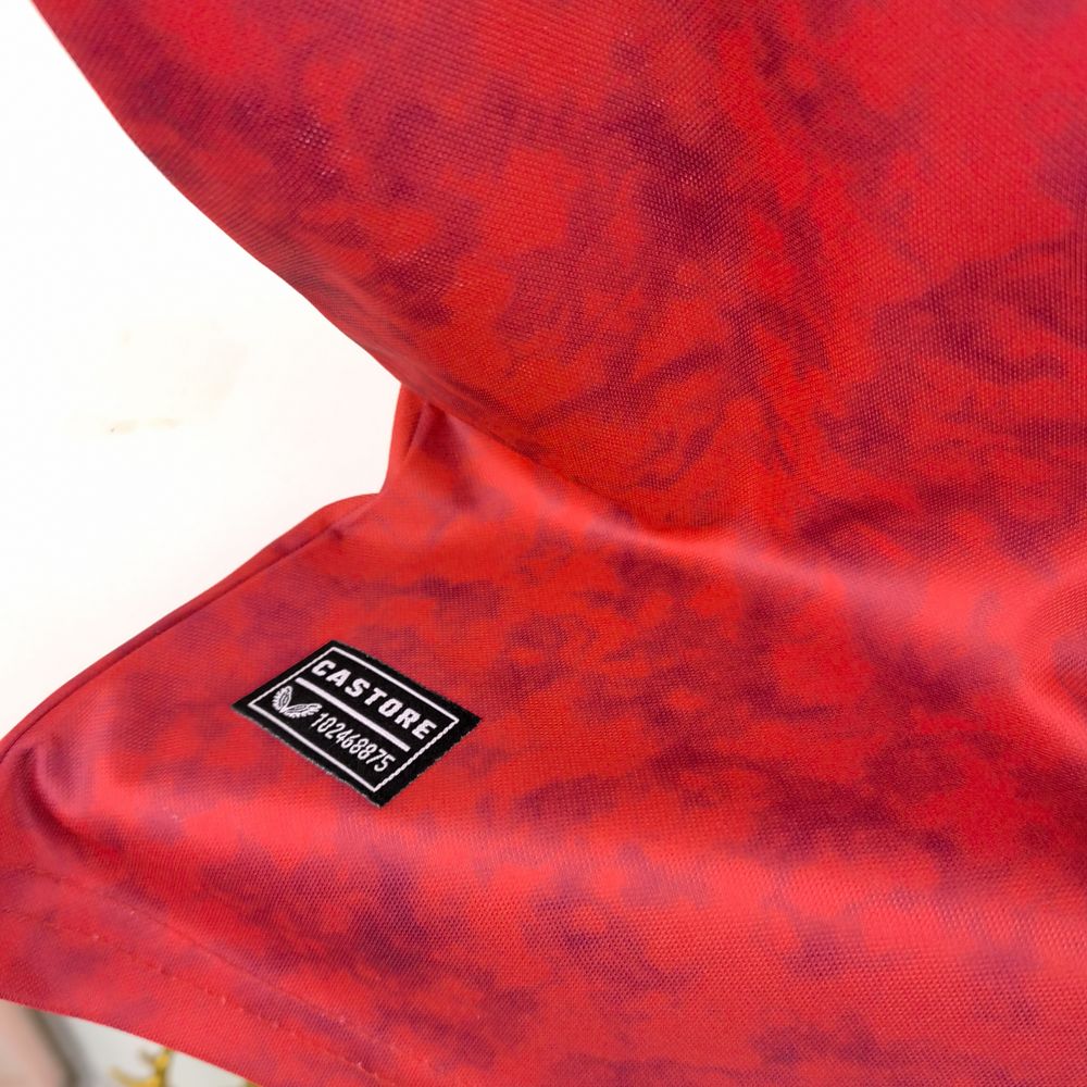 - O escudo do Sevilla FC está bordado no lado esquerdo do peito, enquanto o logotipo da Castore está presente na parte inferior direita.