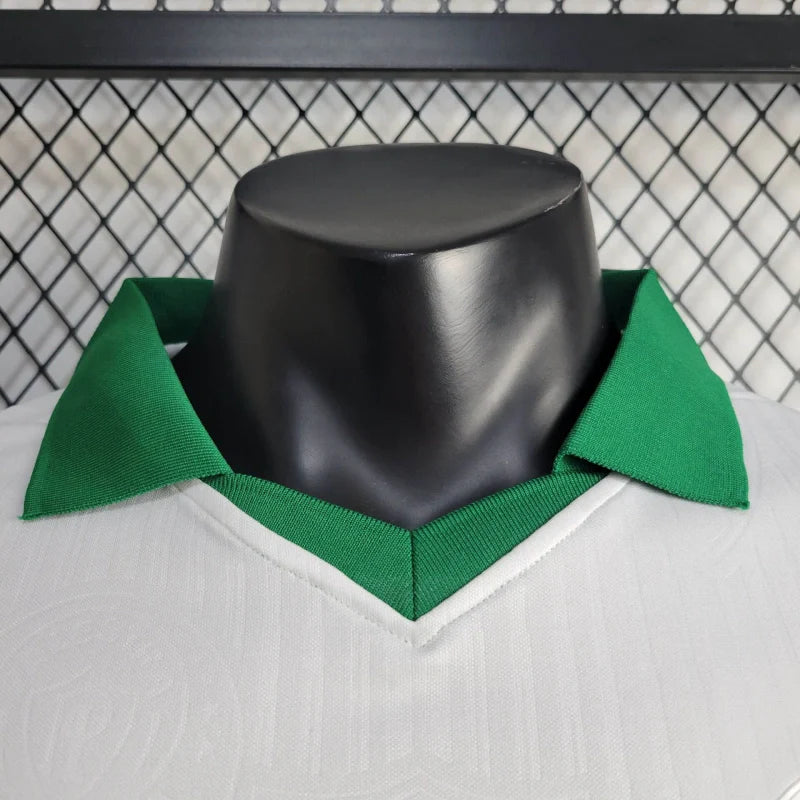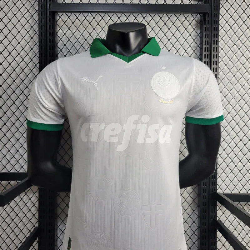 Vista-se com propósito e orgulho com a nova Camisa Especial do Palmeiras 2024, criada em parceria com a PUMA para a campanha #SomosSociedade. Este manto exclusivo é inteiramente branco, simbolizando a paz e a união, com detalhes sutis em verde na gola polo. O escudo do clube e os logos dos patrocinadores aparecem em estilo “whiteout”, destacando a mensagem de igualdade e respeito.