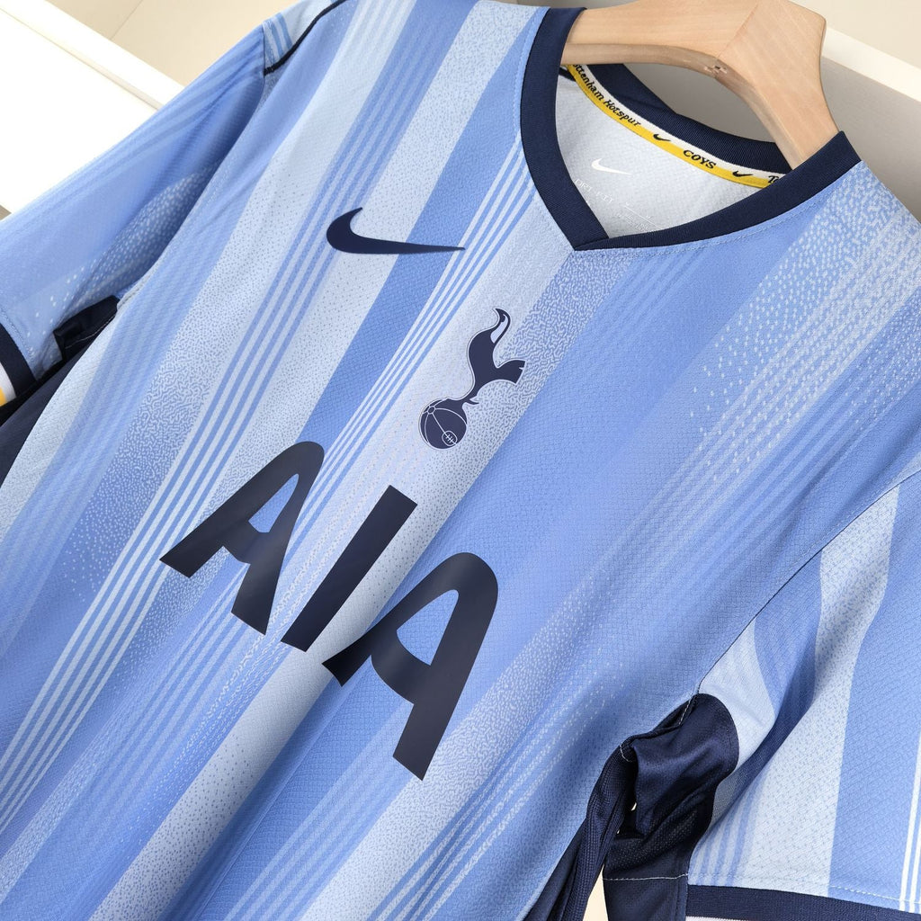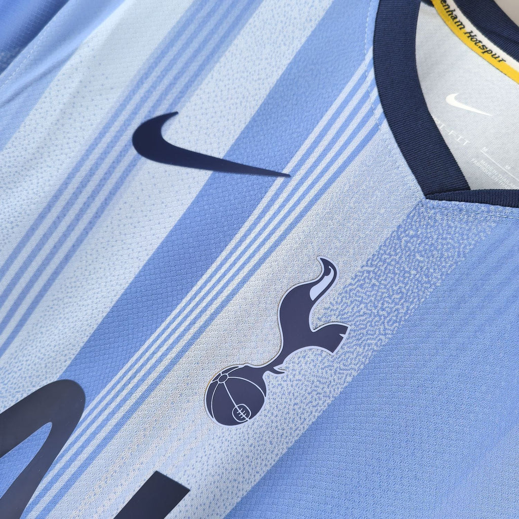 A Camisa 2 do Tottenham Hotspur para a temporada 2024/25, lançada pela Nike, destaca-se pelo seu design moderno em azul claro, com faixas e listras verticais em tons variados de azul. A gola em formato V, de estilo assimétrico, é azul marinho, cor que também aparece nos punhos, no logotipo da Nike e no nome e número dos jogadores. O escudo do clube está centralizado, conferindo um visual equilibrado. Este uniforme "Away" foi projetado com tecnologia Dri-FIT, garantindo conforto e respirabilidade, ideal para os torcedores e jogadores em atividade.